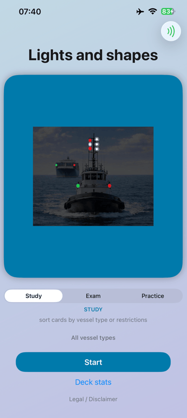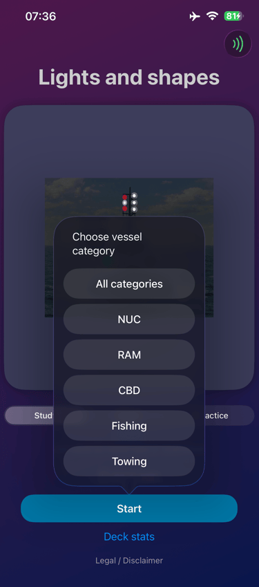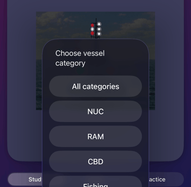 In Study mode after clicking >Start< you can select to study vessels by categories like >Not under command, Restricted in ability to maneuver, Fishing, Towing,...< or all vessels to review all of them.